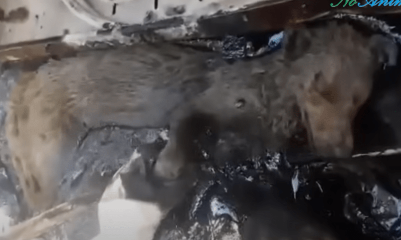 Nearby, four tiny puppies whimpered. Their mother’s suffering was their only world — her scent mixed with the smell of tar and burning. They circled her helplessly, crying for her to wake up.