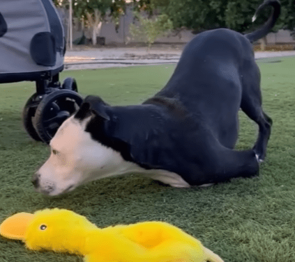 Today, Joey lives like a king. He’s the most spoiled member of the family — the baby of the house who always gets extra treats and endless cuddles. He enjoys his daily walks in the park, proudly rolling in his wheelchair as people stop to admire him. Children love petting him, and Joey greets everyone with that same joyful spirit he showed me on the day we met.