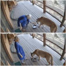Once the footage hit the internet, the story exploded. People around the world fell in love with the image of a gentle grandmother unknowingly befriending a wild cougar. Memes flooded social media—photos of Grandma with captions like, “When your cat eats more than you do.”