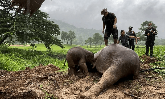 The rescue team rushed forward, working in silence and urgency. They kept her airway clear, poured water over her skin to prevent overheating, and positioned her head so she could breathe easily. Her immense body was still, but the air around her pulsed with emotion — love, fear, protection.