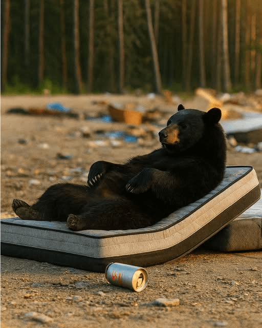 A wild bear, stretched out on a forgotten mattress, reminding us all that rest isn’t a luxury—it’s a necessity.