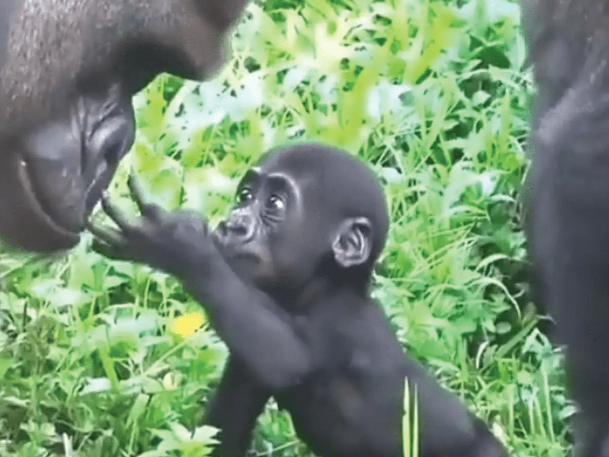 It was early morning, the air thick with the scent of leaves and damp earth. Sunlight filtered gently through the canopy, spilling soft golden light into the lush, green enclosure. Inside, a baby gorilla was taking its first wobbly steps — tiny hands gripping at the grass for balance, dark eyes wide with wonder.